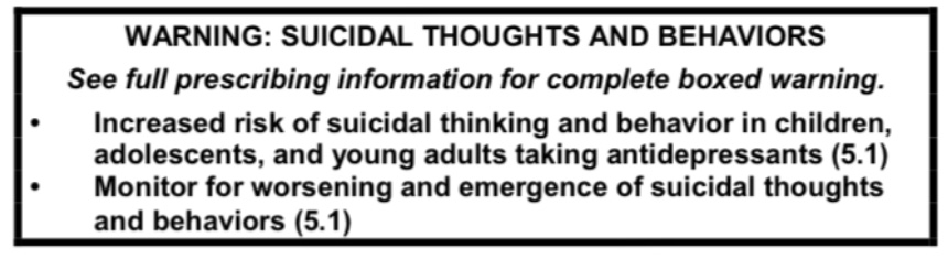 Det är väl känt att antidepressiva ökar risken för självmordsbeteende hos barn och unga. De samlade studierna om dessa antidepressiva visade just det, och fick FDA att redan 2004 ge ut denna ”Black Box Warning”.