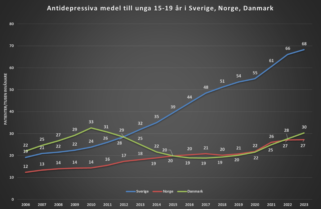 Och vi kommer till 2024. Där det visar sig att 492 unga (10-19) i Sverige körts till akuten efter överdoser av antidepressiva – i just självdestruktivt/suicidalt syfte. Och det, året efter att FN:s barnrättskommitté i sin granskning av Sverige skarpt kritiserat den höga förskrivningen av antidepressiva till barn. (1) En förskrivning som låg långt över den i våra grannländer Norge och Danmark. Så här såg det exempelvis ut 2023 för åldersgruppen 15-19 år (antal per tusen invånare i åldersgruppen):