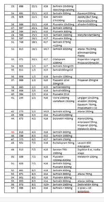 - Flicka 17 år: antidepressiva (Bupropion, Sertralin), neuroleptika (Olanzapin, Quetiapin, Aripripazol).
