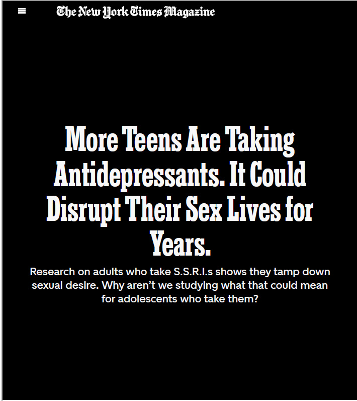 Den stora upplysande nya artikeln om saken More Teens Are Taking Antidepressants. It Could Disrupt Their Sex Lives for Years, från New York Times Magazine, har säkert nått Läkemedelsverket. (6)