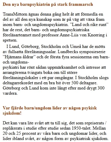 De som tror att den ”psykiska ohälsan” är en nyhet behöver bara gå tillbaka till slutet av 1990-talet. Då utropar läkemedelsbolaget Lundbeck på ledarsidan till sin tidning Transmittorn, stridsropet: ”Den nya barnpsykiatrin på stark frammarsch”. Lundbeck tillverkar det antidepressiva medlet Cipramil, och skriver om den lyckade försäljningsturnén: ”’Land och rike runt’ har de rest, det barn- och ungdomspsykiatriska föreläsarteamet med professor Anne-Liis von Knorring i spetsen.” Man berättar vidare att, även om det är ”lite svårt att ta till sig” så är det ett faktum att mellan ”20 och 25 procent av våra barn och ungdomar lider, och lider ibland svårt, av någon form av psykiatrisk sjukdom”. (9)